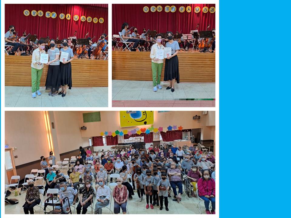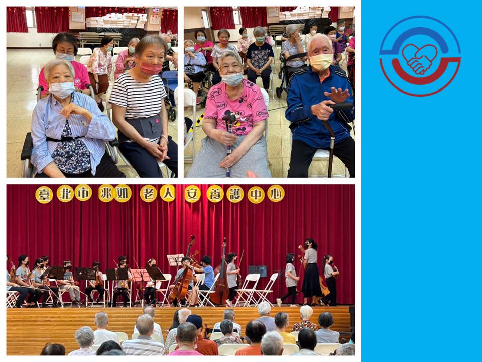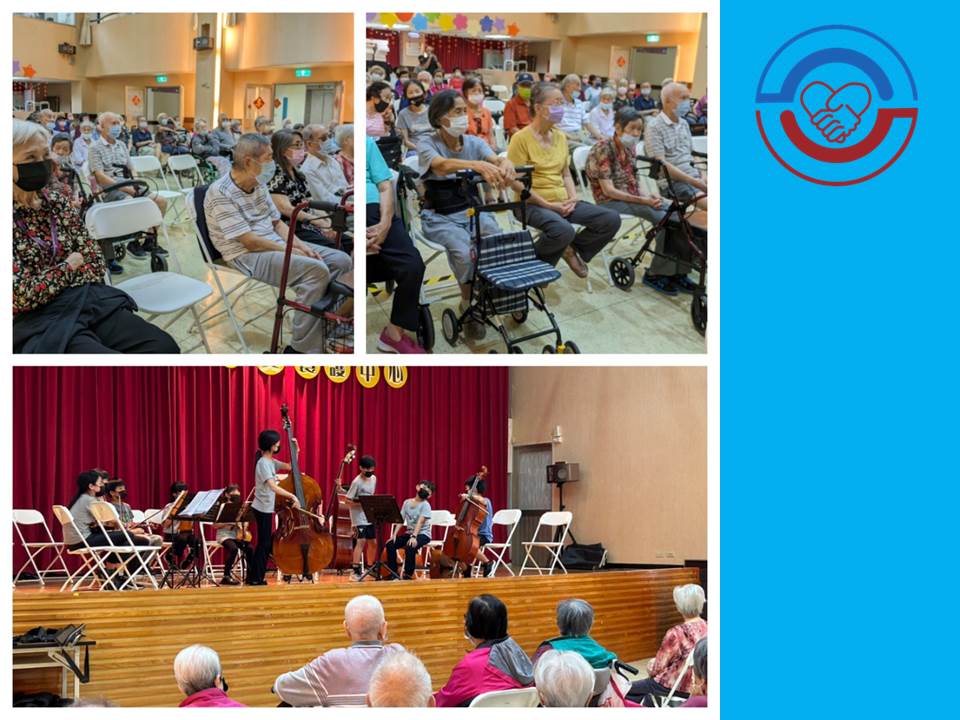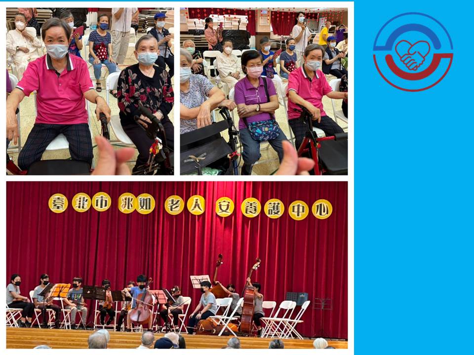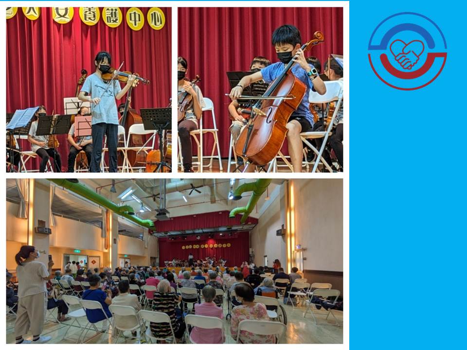 臺北市兆如老人安養護中心的中秋節慶祝活動,第二波於2023年9月27日邀請到政大實小弦樂團在梅軒大禮堂演奏,安養養護日照的爺奶都一起來欣賞表演,出現老幼共融熱鬧景象。 前半段是合奏表演,曲目是:快樂頌、德弗札克「念故鄉」、莫札特小夜曲及卡農,下半段是小學生獨奏。