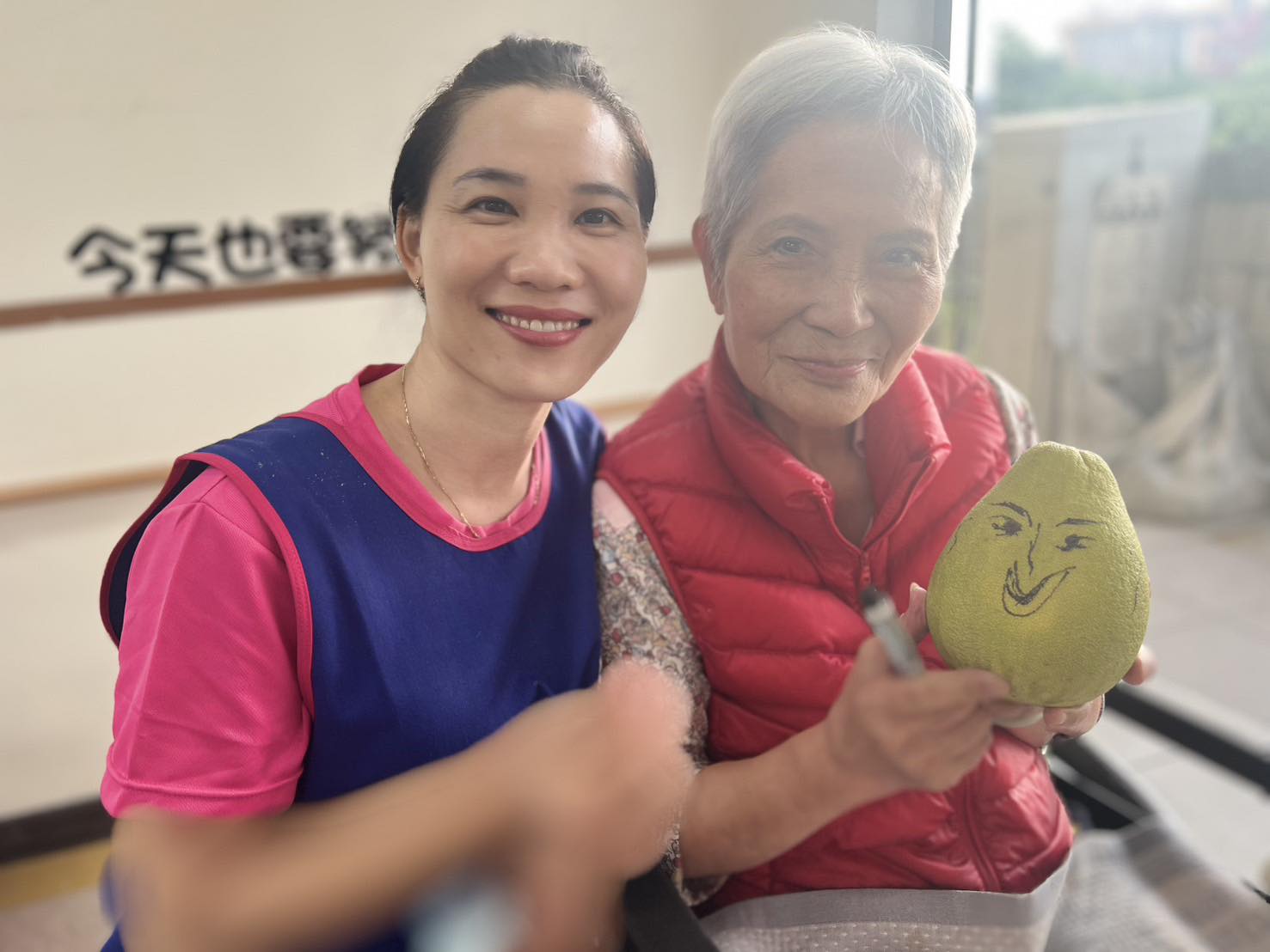 有的專心畫圖,有的把柚子皮戴在頭上開心合影,現場笑聲不斷,氣氛溫馨又熱鬧。看著長輩們一筆一畫專注的神情,以及笑容滿面的模樣,我們深深感受到,中秋的美好不只是月亮圓滿,更是人心的團圓。