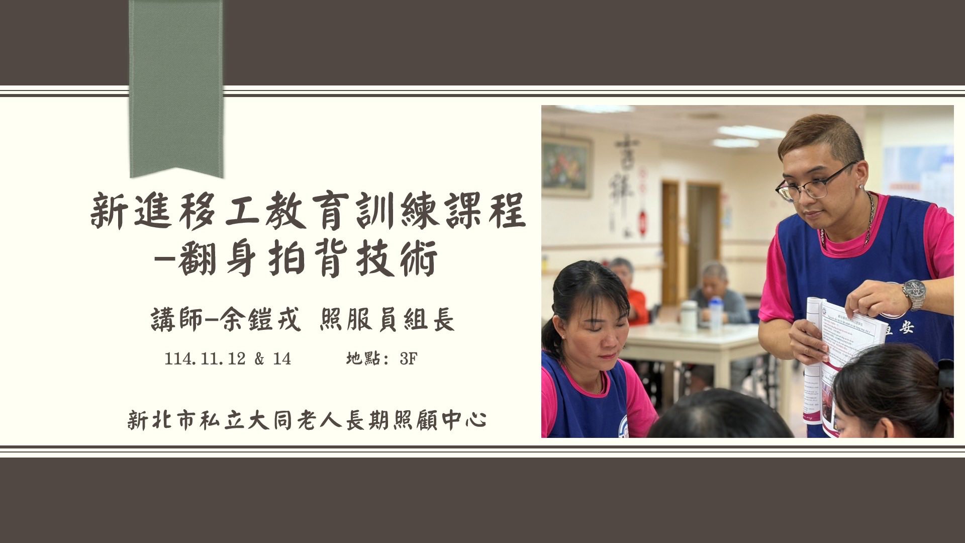 今日由照顧服務員組長 余鎧戎 主講,針對「翻身、拍背標準技術」進行示範與實作教學。